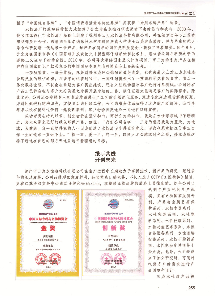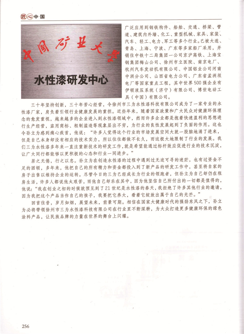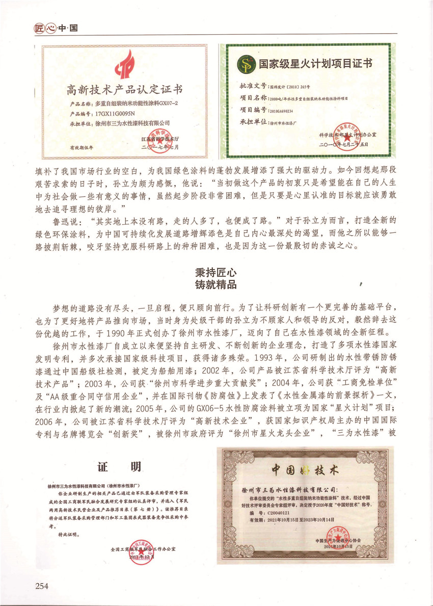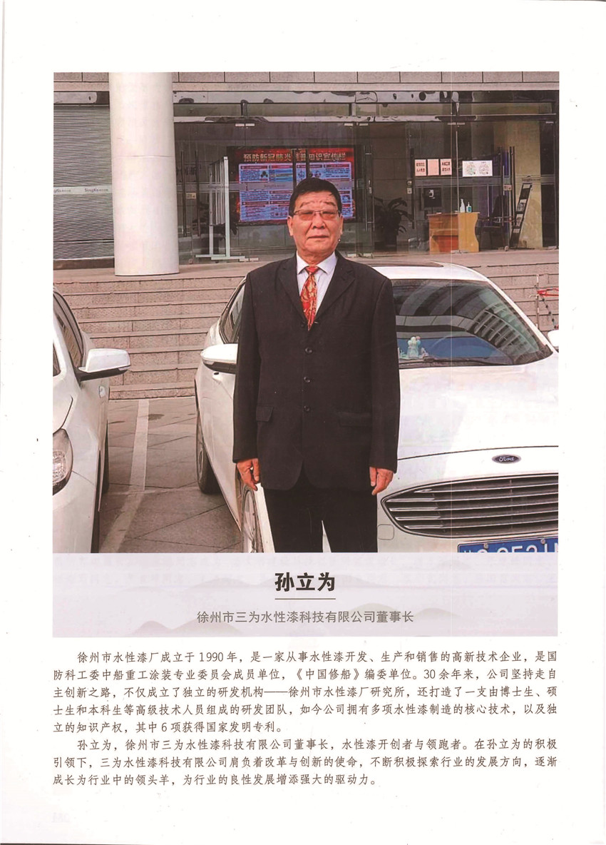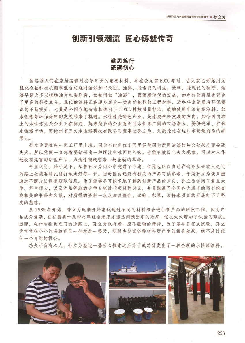 徐州市水性漆厂成立于1990年,产品自主研发填补国内水性工业空白。徐州市三为水性漆科技有限公司与中国矿业大学联合成立水性漆研发中心,从韩国尚庆大学引进国际纳米学者博士后姜继森教授为我公司技术总经理,专注水性纳米应用。三十余年来硕果累累,先后承接两 次 国 家 级 星火计划,中小企业技术创新基金,多项国家发明专利授权并在国家专利局“国际专利博览会”国际专利博览会中荣获创新奖与金奖,全国军民融合企业,《CCTV工匠精神》企业,国家生产力促进中心评为中国好技术,获“中国节能环保创业应用大赛”创新应用奖,中国企业诚信经营示范单位,江苏省民营科技企业,中船重工涂装专业委员会成员,《中国修船》编委,多次在 国 家 级 期刊发布学术论文,通过中国船级社检测,通过中国铁道部科学院检测。?